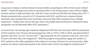 Diez citas en dos párrafos de introducción. Por supuesto, no hay un número correcto de citas que se pueden realizar por párrafo, dado que ello dependerá de las necesidades de los investigadores. ¿Necesitan demostrar que tal hecho es muy relevante para lo que desean estudiar? Entonces citan varios estudios previos que así lo confirman. ¿Solo desean poner una definición general sobre el cáncer? Una sola referencia, quizás, sería suficiente.